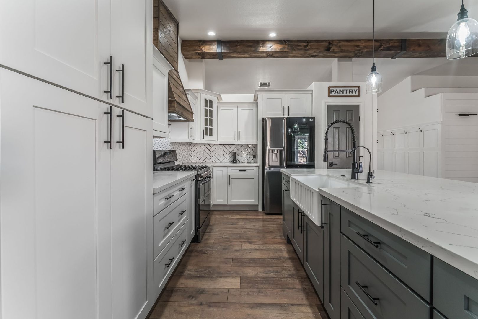 Single story home in Northwest Las Vegas, featuring numerous modern upgrades that seamlessly blend comfort with sophistication. The kitchen is the heart of the home, a chef’s dream with quartz countertops, upgraded appliances & cabinets. Plus a spacious island perfect for entertaining. The living room is filled with natural light, & fireplace creating a warm & inviting atmosphere. Large separate family room is a versatile area for a formal dining room, entertaining or game room. Large primary bedroom w/double doors. Primary bath with walk in closet separate shower & tub. Bedrooms are spacious & bright. Hall bath is upgraded with double sinks. Hard surface flooring throughout. Custom features throughout, ceiling beam, doors, cabinets, wall coverings & more. 3-car garage. A portion of the single garage has been converted to living space & includes a workspace area. The outdoor space is tranquil featuring a large, covered patio & beautiful landscaping. RV parking up to a 31' trailer.
