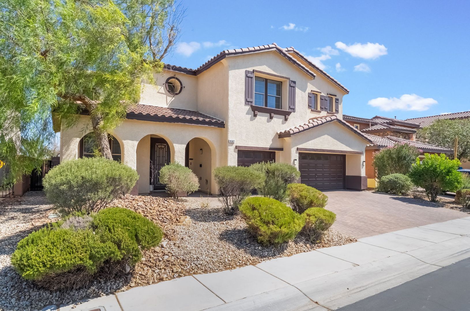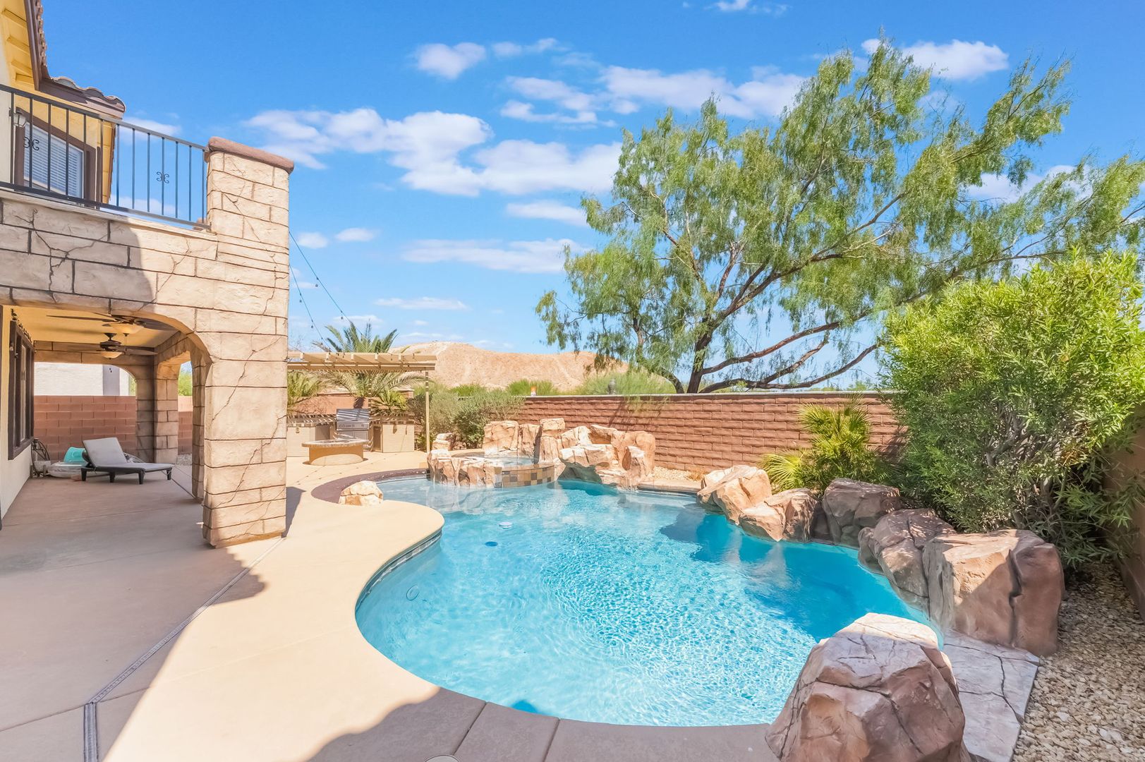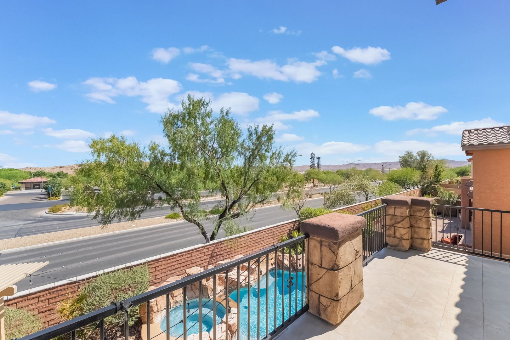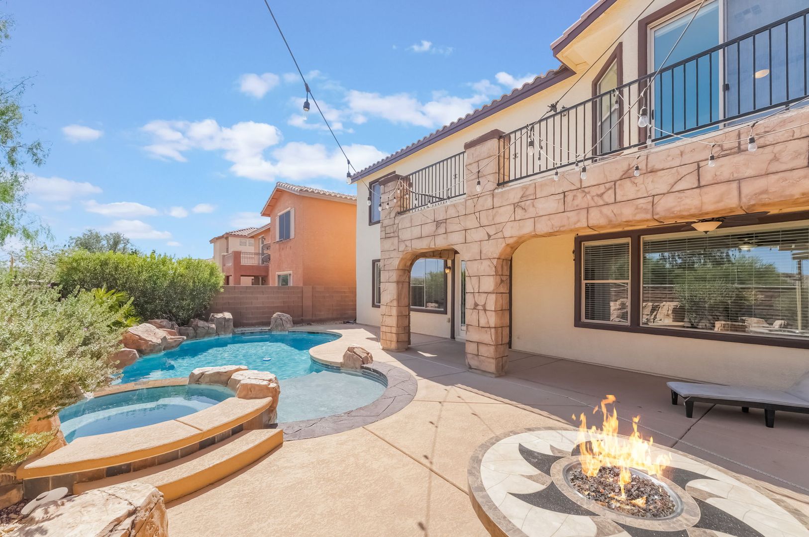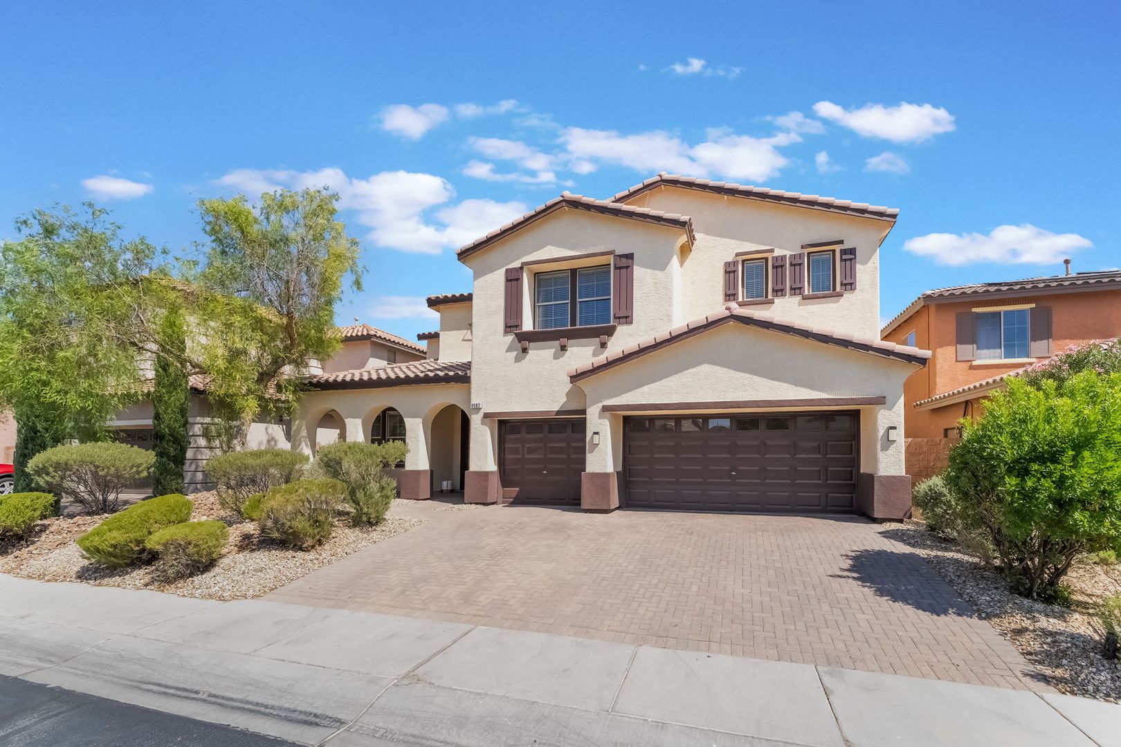 Stunning home with a resort-style pool and spa, located in the exclusive gated community of Marble Canyon in Mountains Edge. Just across the street behind this magnificent home sits Exploration Peak Park. Breathtaking views from the primary bedroom balcony. Mountains Edge Regional Park is minutes away. This impressive residence features a 3-car garage, five spacious bedrooms, & four full bathrooms, with one bedroom & bath conveniently located on the main floor. Gourmet kitchen, complete with a large island, granite countertops, Butler’s pantry, & upgraded cabinets, is perfect for culinary enthusiasts. Enjoy high ceilings that create an airy feel throughout the home, along with a generous loft, family room, dining area, & versatile den/office. Outside, entertain friends with a built-in BBQ or cozy up around the fire pit. The laundry room includes a sink and ample cabinetry. Ideally situated near shopping, dining, schools, and easy access to the airport and the Las Vegas Strip.
