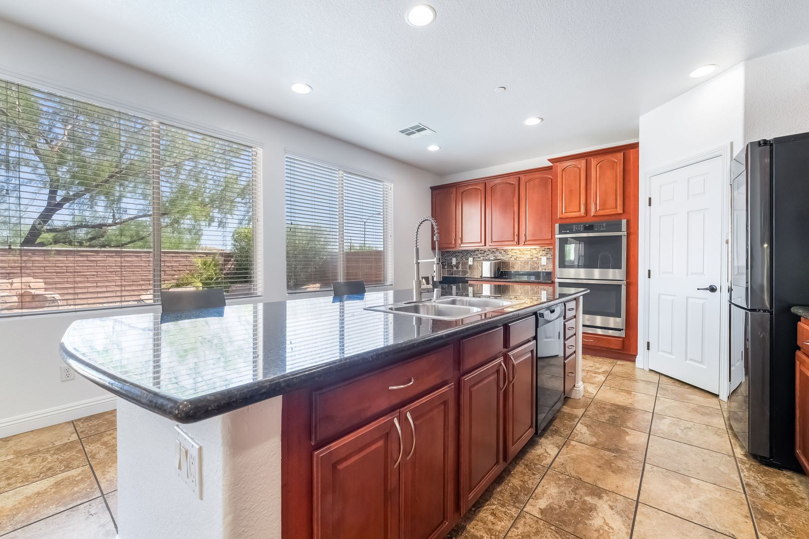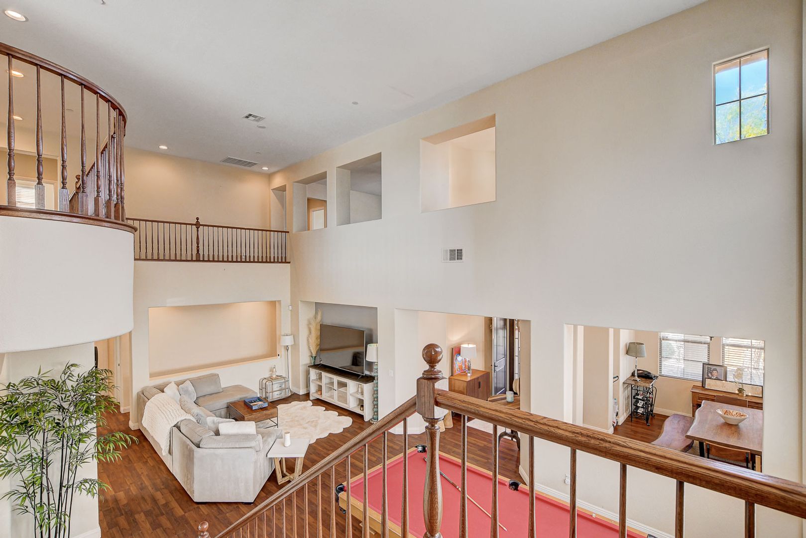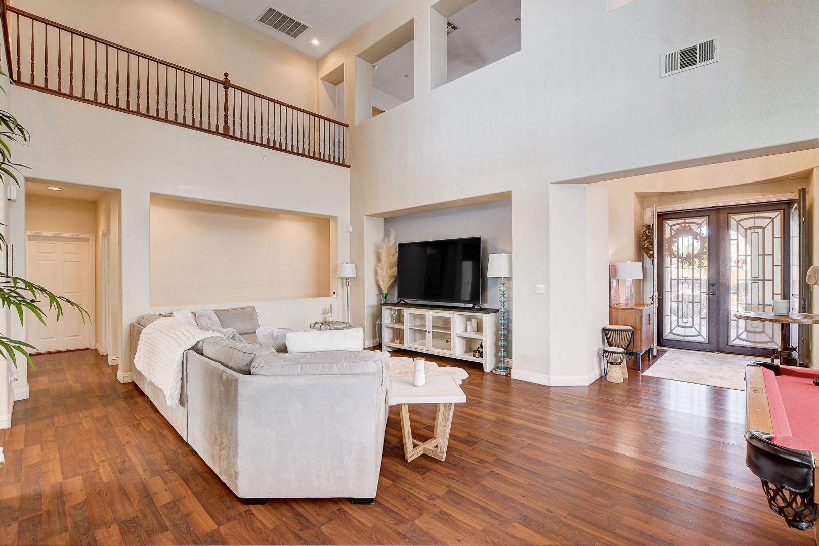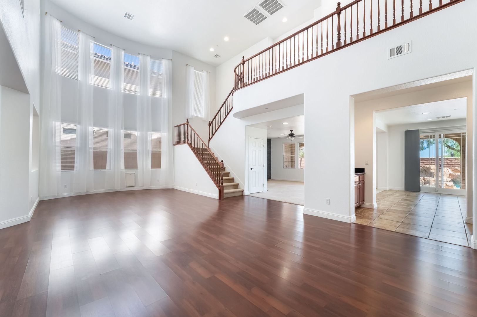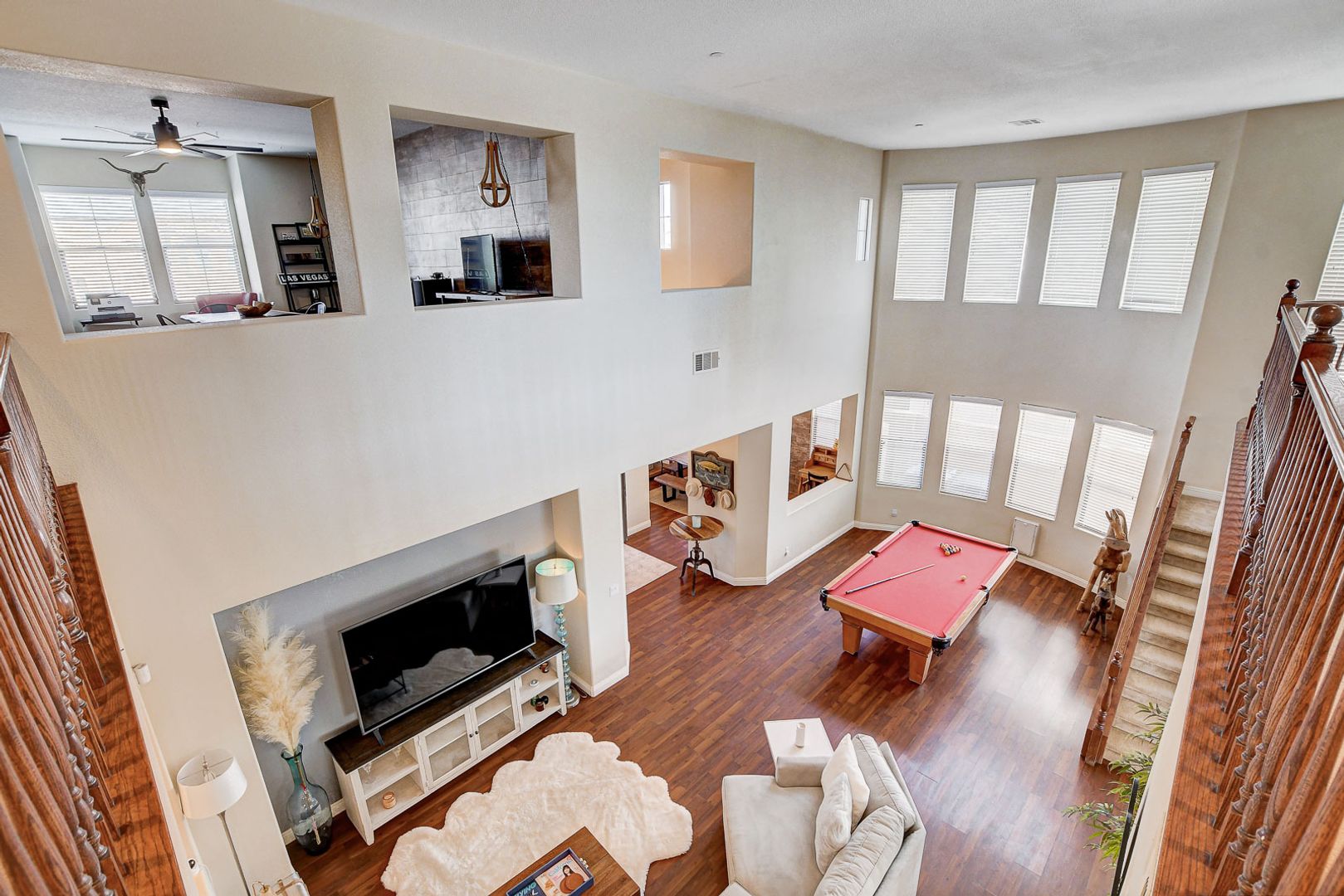 Stunning home with a resort-style pool and spa, located in the exclusive gated community of Marble Canyon in Mountains Edge. Just across the street behind this magnificent home sits Exploration Peak Park. Breathtaking views from the primary bedroom balcony. Mountains Edge Regional Park is minutes away. This impressive residence features a 3-car garage, five spacious bedrooms, & four full bathrooms, with one bedroom & bath conveniently located on the main floor. Gourmet kitchen, complete with a large island, granite countertops, Butler’s pantry, & upgraded cabinets, is perfect for culinary enthusiasts. Enjoy high ceilings that create an airy feel throughout the home, along with a generous loft, family room, dining area, & versatile den/office. Outside, entertain friends with a built-in BBQ or cozy up around the fire pit. The laundry room includes a sink and ample cabinetry. Ideally situated near shopping, dining, schools, and easy access to the airport and the Las Vegas Strip.