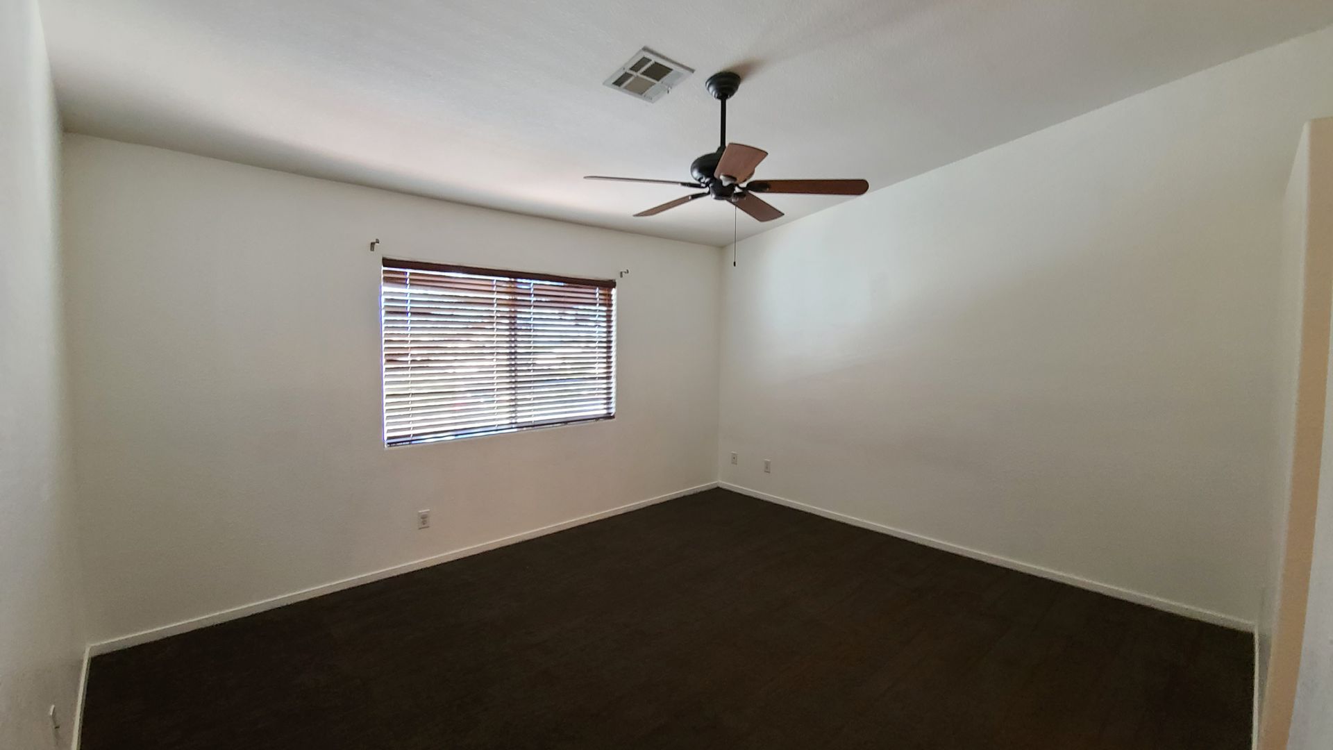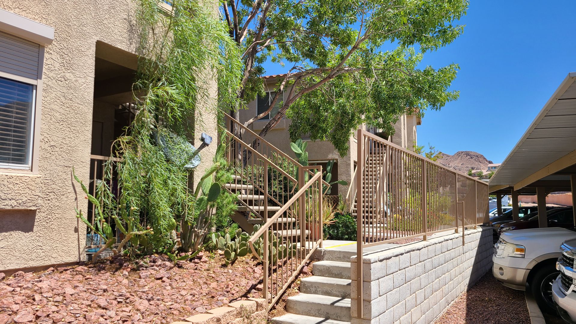 Upstairs condo with mountain and city views near Sunrise Mountain. Kitchen features granite counter tops, tile backsplash and stainless steel appliances. Wood laminate flooring. Primary bedroom with ceiling fan and mirrored wardrobe doors. Primary bath with double sinks. High ceilings, covered patio and security door. Gated community with pool/spa.